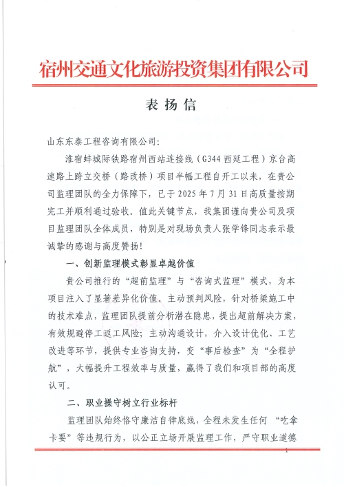 article------>{"id":7032,"cid":20,"subCid":null,"title":"喜報(bào)!東泰咨詢監(jiān)理的淮宿蚌城際鐵路宿州西站連接線(G344西延工程)收到業(yè)主的表揚(yáng)信","shortTitle":"","tagId":"","attr":"","articleView":"","source":"二公司","author":"張學(xué)鋒","description":"近日,山東東泰工程咨詢有限公司承監(jiān)的淮宿蚌城際鐵路宿州西站連接線(G344西延工程),獲建設(shè)單位宿州交通文化旅游投資集團(tuán)有限公司的書面表揚(yáng)。\n本項(xiàng)目路線全長3.862公里,工程造價(jià)3.2億元,屬一級公路標(biāo)準(zhǔn)兼具市政功能,行車道為雙向六車道+慢車道+人行道,建設(shè)標(biāo)準(zhǔn)高、功能復(fù)合性強(qiáng),本項(xiàng)目需下穿京臺高速(高速路改橋)、淮宿蚌城際鐵路(在建)、起終點(diǎn)涉國省道,面臨拆遷難、工期緊、多點(diǎn)交叉施工等多重挑戰(zhàn)...","img":"","content":"<p class=\"MsoNormal\" style=\"text-indent: 28.0pt; line-height: 25.0pt; mso-pagination: widow-orphan; background: white;\"><span style=\"font-size: 18px; font-family: arial, helvetica, sans-serif; color: rgb(64, 64, 64);\">近日,山東東泰工程咨詢有限公司承監(jiān)的淮宿蚌城際鐵路宿州西站連接線(<span lang=\"EN-US\">G344</span>西延工程),獲建設(shè)單位宿州交通文化旅游投資集團(tuán)有限公司的書面表揚(yáng)。</span></p>\n<p class=\"MsoNormal\" style=\"text-indent: 28.0pt; line-height: 25.0pt; mso-pagination: widow-orphan; background: white;\"><span style=\"font-size: 18px; font-family: arial, helvetica, sans-serif; color: rgb(64, 64, 64);\">本項(xiàng)目路線全長<span lang=\"EN-US\">3.862</span>公里,工程造價(jià)<span lang=\"EN-US\">3.2</span>億元,屬一級公路標(biāo)準(zhǔn)兼具市政功能,行車道為雙向六車道<span lang=\"EN-US\">+</span>慢車道<span lang=\"EN-US\">+</span>人行道,建設(shè)標(biāo)準(zhǔn)高、功能復(fù)合性強(qiáng),本項(xiàng)目需下穿京臺高速(高速路改橋)、淮宿蚌城際鐵路(在建)、起終點(diǎn)涉國省道,面臨拆遷難、工期緊、多點(diǎn)交叉施工等多重挑戰(zhàn)。自<span lang=\"EN-US\">2024</span>年<span lang=\"EN-US\">6</span>月進(jìn)場,面對<span lang=\"EN-US\">10</span>月才交付部分工作面的不利開局,東泰咨詢淮宿蚌城際鐵路宿州西站連接線總監(jiān)辦果斷摒棄傳統(tǒng)被動(dòng)監(jiān)理模式,主動(dòng)融入項(xiàng)目管理,積極協(xié)調(diào)管控質(zhì)量、進(jìn)度、安全等工作。</span></p>\n<p class=\"MsoNormal\" style=\"text-indent: 28.0pt; line-height: 25.0pt; mso-pagination: widow-orphan; background: white;\"><span style=\"font-size: 18px; font-family: arial, helvetica, sans-serif; color: rgb(64, 64, 64);\">項(xiàng)目建設(shè)過程中,東泰咨詢淮宿蚌城際鐵路宿州西站連接線總監(jiān)辦始終堅(jiān)持嚴(yán)謹(jǐn)細(xì)致的工作態(tài)度,對施工質(zhì)量實(shí)施全過程、全方位的管控。特別是在隱蔽工程及關(guān)鍵工序中,監(jiān)理人員嚴(yán)格把關(guān),全程旁站,及時(shí)發(fā)現(xiàn)并督促整改各類質(zhì)量問題,聯(lián)合項(xiàng)目部先后制定了<span lang=\"EN-US\">2024</span>年“春節(jié)前攻堅(jiān)計(jì)劃”與<span lang=\"EN-US\">2025</span>年“雨季前決勝計(jì)劃”。通過創(chuàng)新采用“地下先行、堆載預(yù)壓”,<span lang=\"EN-US\">2024</span>年優(yōu)先完成全部地下管網(wǎng)和涵洞工程,為<span lang=\"EN-US\">2025</span>年路基、基層施工贏得寶貴時(shí)間,實(shí)現(xiàn)了雨季來臨前行車道完成一層水穩(wěn)層的任務(wù)目標(biāo);通過督導(dǎo)京臺高速路改橋“半幅施工、半幅保通”等方案,攻克關(guān)鍵節(jié)點(diǎn)。以“超前監(jiān)理”和“咨詢式監(jiān)理”的理念,有效規(guī)避了潛在風(fēng)險(xiǎn),確保了工程質(zhì)量和進(jìn)度。</span></p>\n<p class=\"MsoNormal\" style=\"text-indent: 28.0pt; line-height: 25.0pt; mso-pagination: widow-orphan; background: white;\"><span style=\"font-size: 18px; font-family: arial, helvetica, sans-serif; color: rgb(64, 64, 64);\">榮譽(yù)的背后離不開東泰咨詢公司及二公司的正確領(lǐng)導(dǎo),下一步,東泰咨詢淮宿蚌城際鐵路宿州西站連接線總監(jiān)辦將繼續(xù)秉持“東泰咨詢、讓您放心”的企業(yè)口號,踐行二公司“誠信為本、創(chuàng)新為魂、精于品質(zhì)、韻于匠心”的口號,帶領(lǐng)團(tuán)隊(duì)繼續(xù)努力,不斷擦亮“東泰咨詢”品牌,為項(xiàng)目<span lang=\"EN-US\">2026</span>年<span lang=\"EN-US\">6</span>月早日建成通車保駕護(hù)航。</span></p>\n<p class=\"MsoNormal\" style=\"text-indent: 28pt; line-height: 25pt; background: white; text-align: center;\"><span style=\"font-size: 18px; font-family: arial, helvetica, sans-serif; color: rgb(64, 64, 64);\"><img src=\"/public/uploads/default/2025/08/29/1756432140871_source_1.jpg\" alt=\"\" width=\"500\" height=\"707\"></span></p>\n<p class=\"MsoNormal\" style=\"text-indent: 28pt; line-height: 25pt; background: white; text-align: center;\"><span style=\"font-size: 18px; font-family: arial, helvetica, sans-serif; color: rgb(64, 64, 64);\"><img src=\"/public/uploads/default/2025/08/29/1756432150626_source_2.jpg\" alt=\"\" width=\"500\" height=\"707\"></span></p>","orderBy":null,"status":0,"pv":294,"link":"","createdAt":"2025-08-29 09:48:05","updatedAt":"2026-04-09 19:46:30","department":"二公司","field":{},"tags":[]}